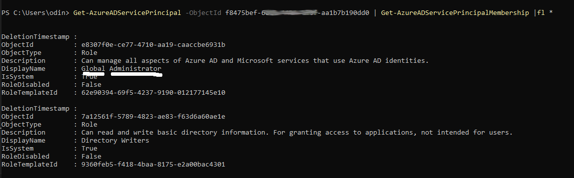 # Authenticate to the tenant $username = "username@domain.com" $password = 'YourVeryStrongPassword' $SecurePassword = ConvertTo-SecureString “$password” -AsPlainText -Force $Credential = New-Object System.Management.Automation.PSCredential($username, $SecurePassword) Connect-AzureAD -Credential $Credential $UserRoles = Get-AzureADDirectoryRole | ForEach-Object { $Role = $_ $RoleDisplayName = $_.DisplayName $RoleMembers = Get-AzureADDirectoryRoleMember -ObjectID $Role.ObjectID ForEach ($Member in $RoleMembers) { $RoleMembership = [PSCustomObject]@{ MemberName = $Member.DisplayName MemberID = $Member.ObjectID MemberOnPremID = $Member.OnPremisesSecurityIdentifier MemberUPN = $Member.UserPrincipalName MemberType = $Member.ObjectType RoleID = $Role.RoleTemplateId RoleDisplayName = $RoleDisplayName } $RoleMembership } } $UserRoles | ?{$_.MemberType -eq "ServicePrincipal"}